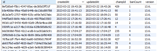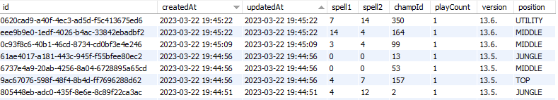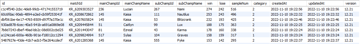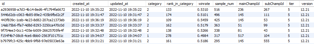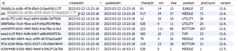 - 추출한 데이터를 포지션 카테고리에 따라 묶고, 다음과 같이 DB에 저장하고 승률과 티어를 가공합니다.